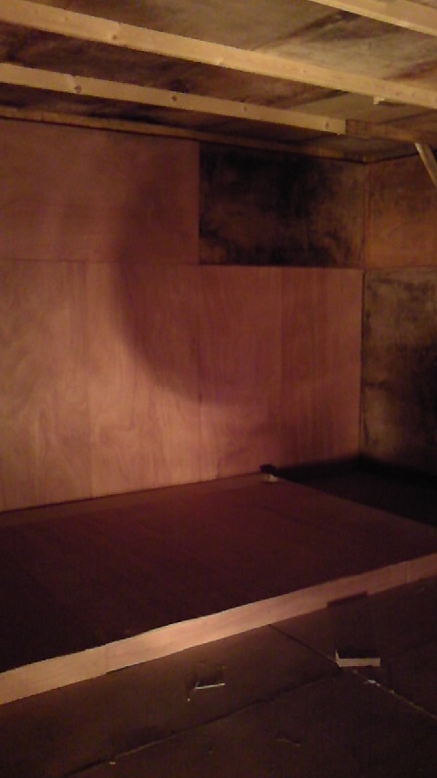 ちょっと見にくいかもしれませんが天井の上にブルーシートがかかってます。