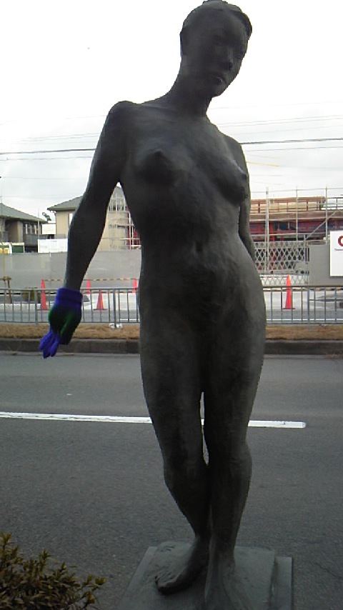 この寒空の中は裸の女性の像に誰かが手袋をしてあげたようだ。優しい。
