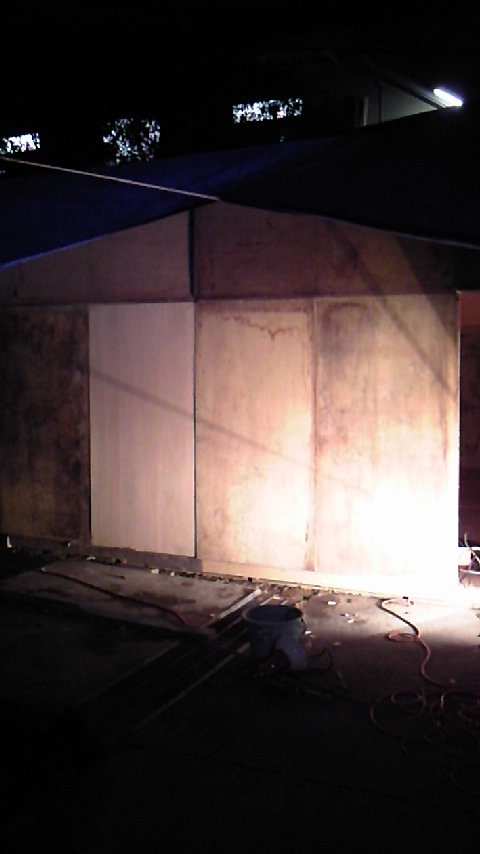 ちょっと見にくいかもしれませんが天井の上にブルーシートがかかってます。