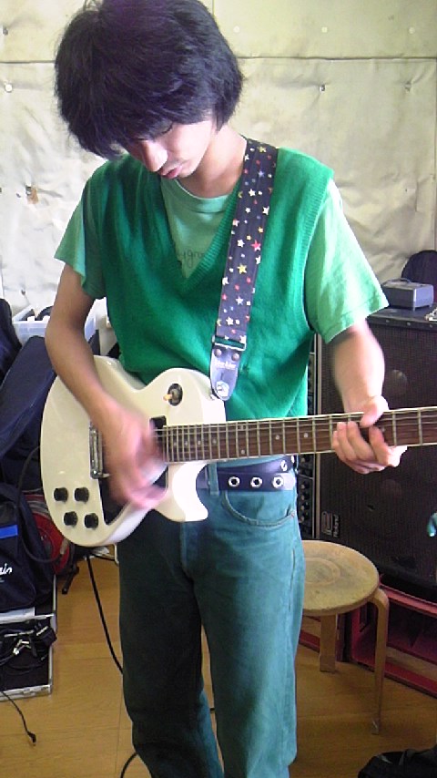 友達の白いギター。昭和っぽいベスト。