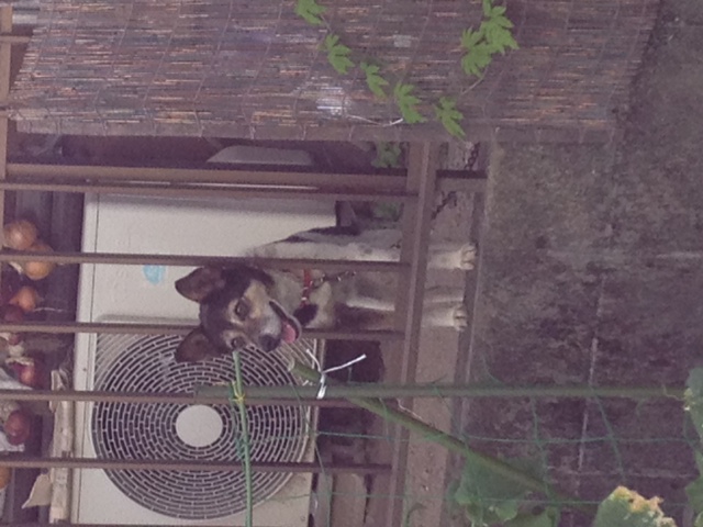民家の柵から出てきた犬。かわいい。